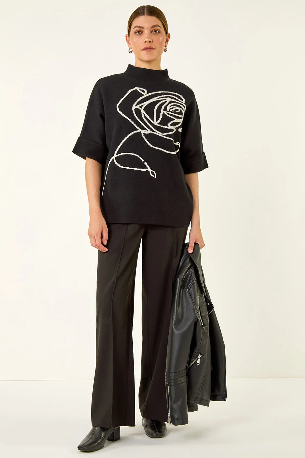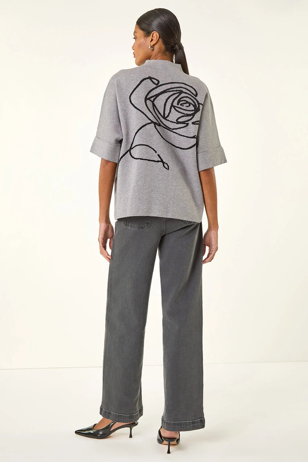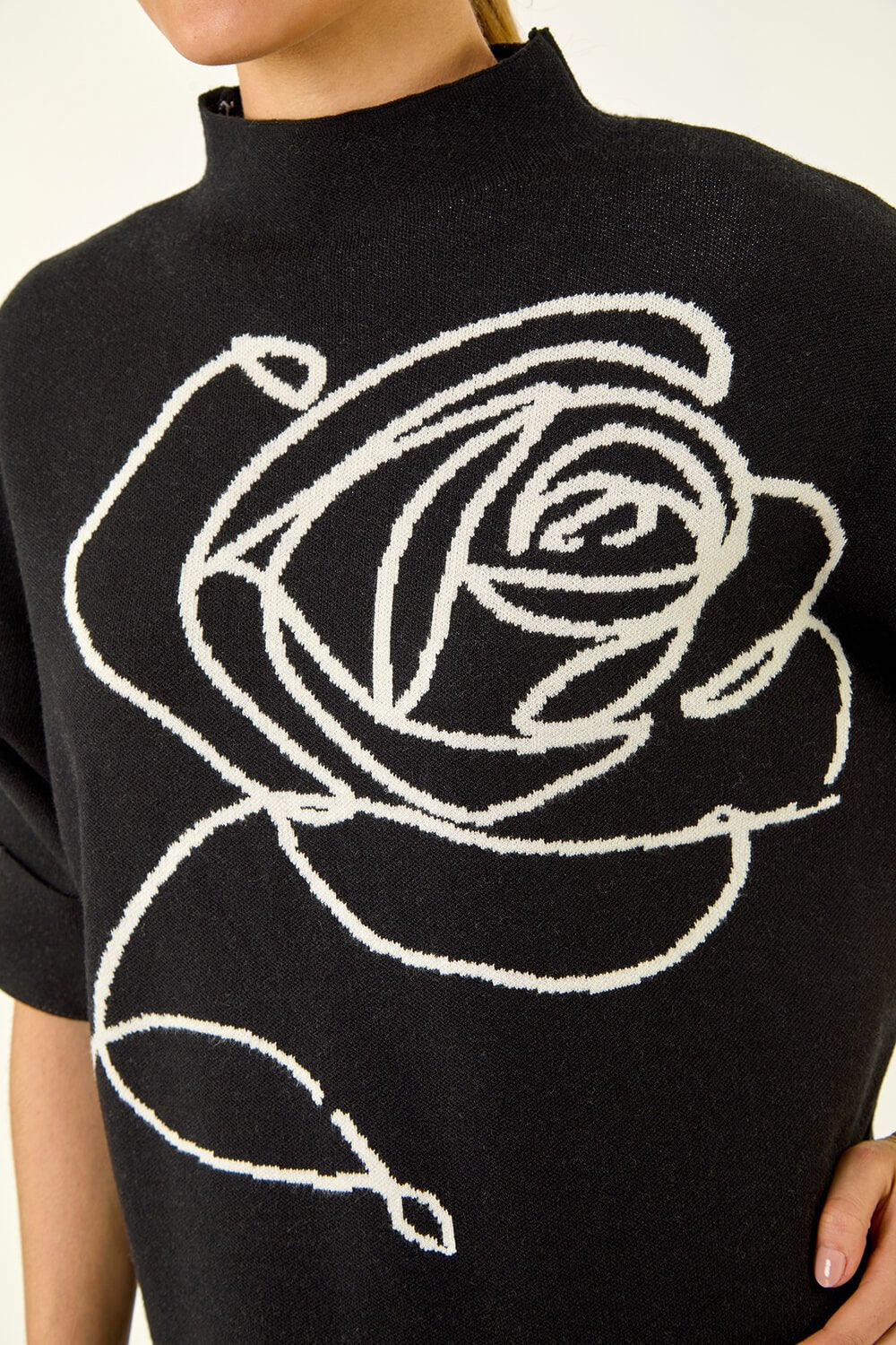 Add a touch of floral elegance to your Autumn/Winter wardrobe with this stunning rose detail jumper. Featuring a high neckline and stylish bat wing silhouette with short sleeves, this jumper is both comfortable and chic. The delicate rose embellishments add a feminine touch to this cosy knit. Pair with your favourite jeans and ankle boots for a casual yet sophisticated look that's perfect for the season!